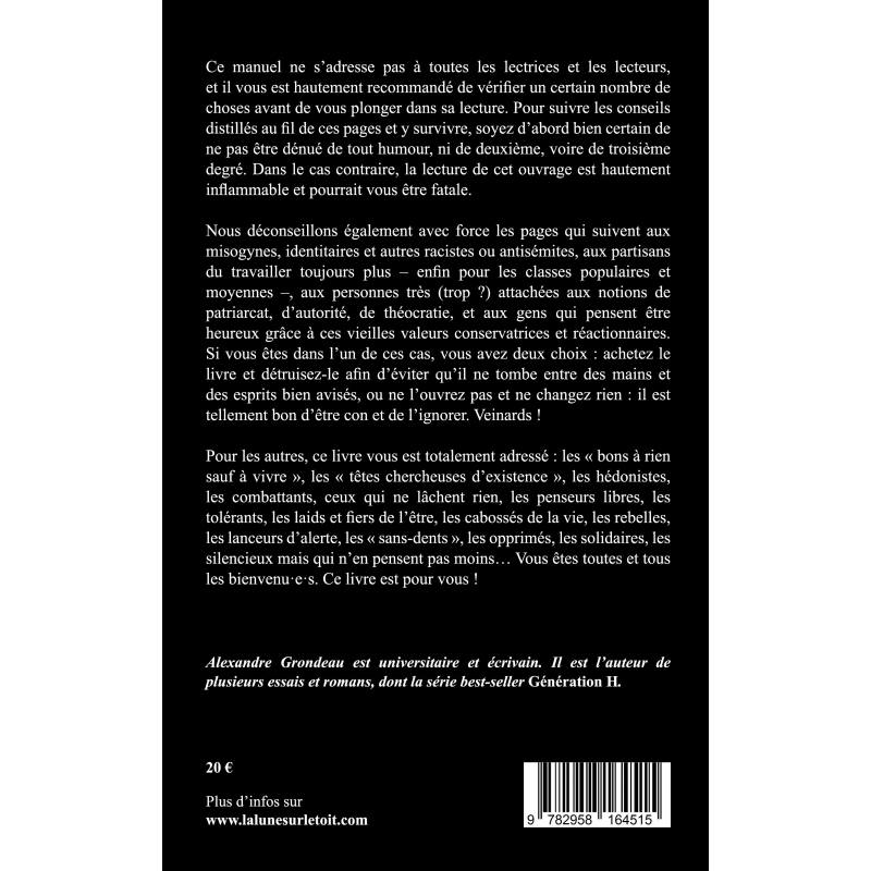 Nous déconseillons également avec force les pages qui suivent aux misogynes, identitaires et autres racistes ou antisémites, aux partisans du travailler toujours plus – enfin pour les classes populaires et moyennes –, aux personnes très (trop ?) attachées aux notions de patriarcat, d’autorité, de théocratie, et aux gens qui pensent être heureux grâce à ces vieilles valeurs conservatrices et réactionnaires. Si vous êtes dans l’un de ces cas, vous avez deux choix : achetez le livre et détruisez-le afin d’éviter qu’il ne tombe entre des mains et des esprits bien avisés, ou ne l’ouvrez pas et ne changez rien : il est tellement bon d’être con et de l’ignorer. Veinards !